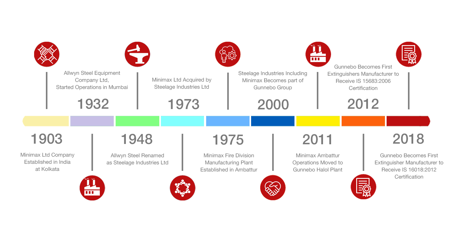 Minimax was established as 1st Indian fire extinguisher brand in 1903 with the head office in Kolkata. Later in 1973 the brand was transferred to Steelage which was subsequently renamed as Gunnebo India Ltd in 2005. Fire Extinguishers and accessories under this brand are manufactured by Gunnebo India, at its factory in Halol, Gujarat since 2012. Halol factory is among the 8 factories of Gunnebo worldwide and it follows the highly efficient Gunnebo Operations System (GOS) which focuses on quality, delivery, cost, use of resources, health & safety and securing employee commitment to drive continuous improvement and bring value to the customers. The factory complex also houses a fully equipped lab and fire room to support continuous development and ensures consistent quality.